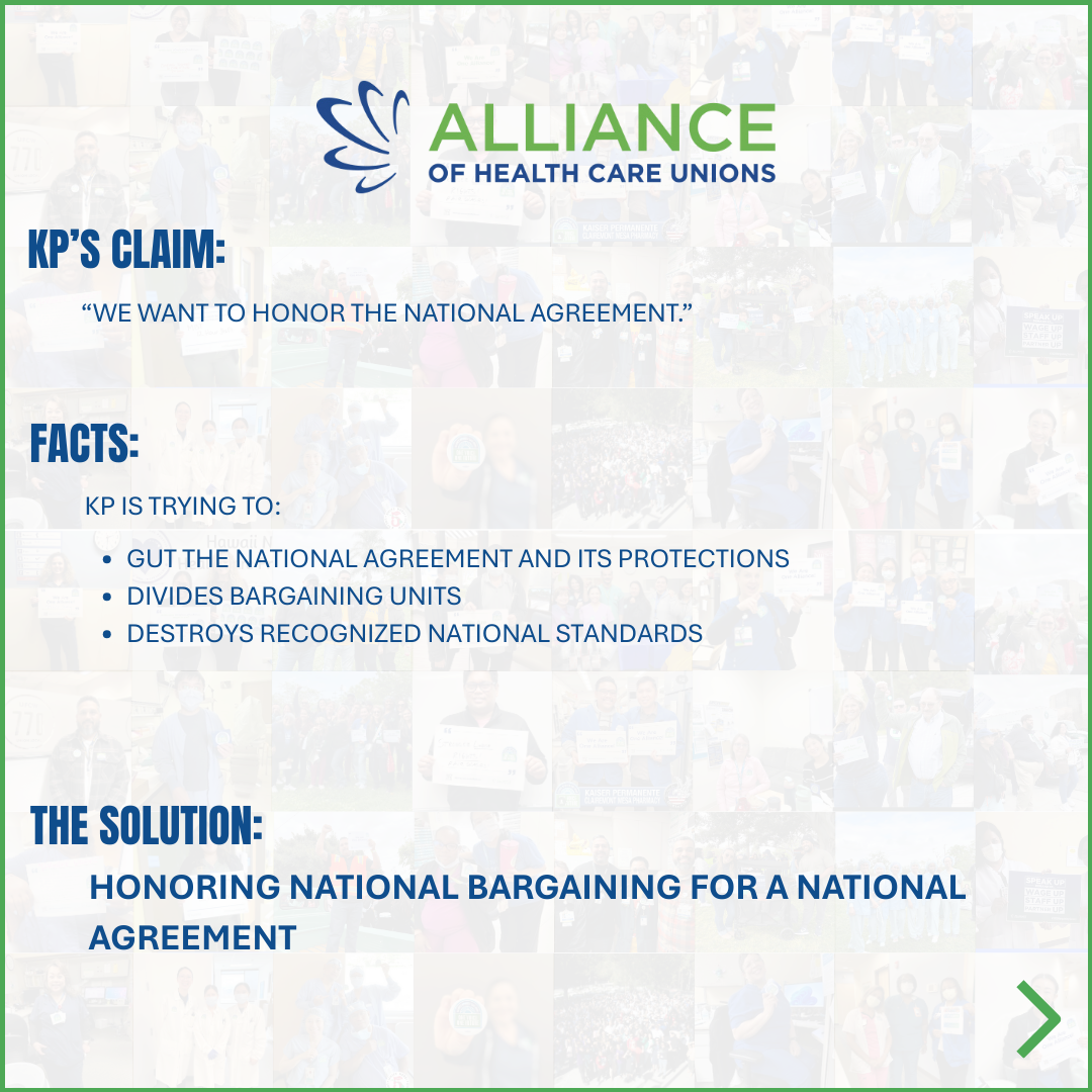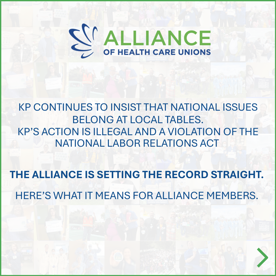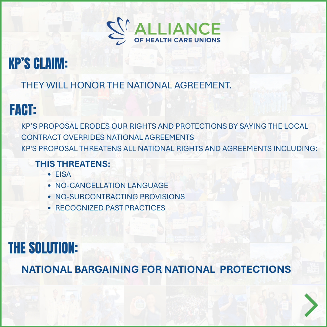 Kaiser Permanente continues to insist that moving from National Bargaining to local bargaining is faster, delivers enhanced wages and benefits, and is “the best path to deliver a comprehensive contract” for Alliance members.