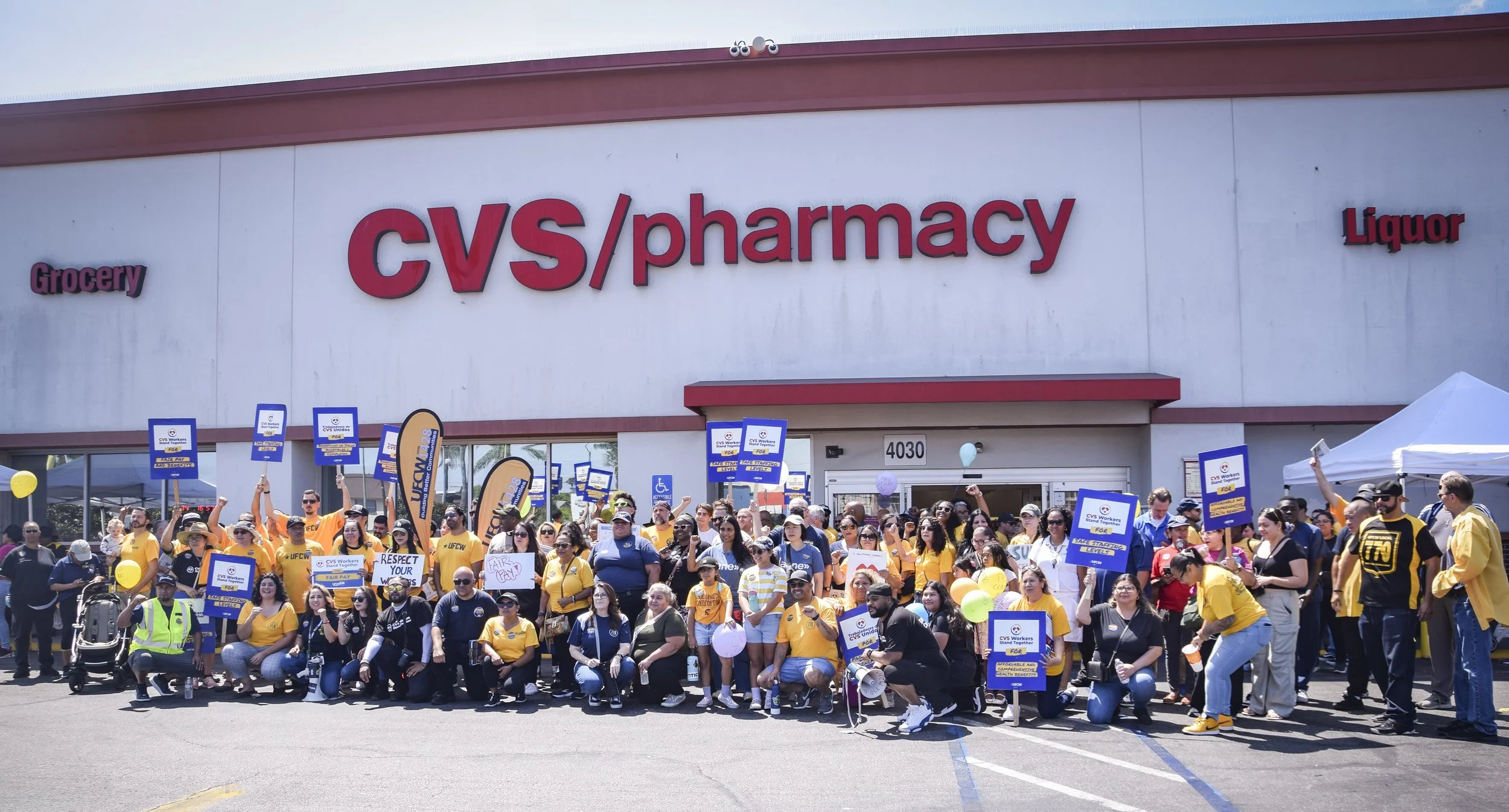 trabajadores de CVS se manifiestan por salario justo, atención médica accesible y tiendas seguras en farmacia del sur de L.A.