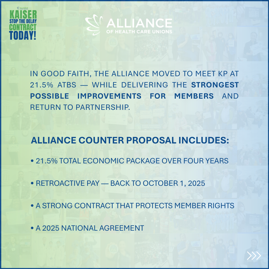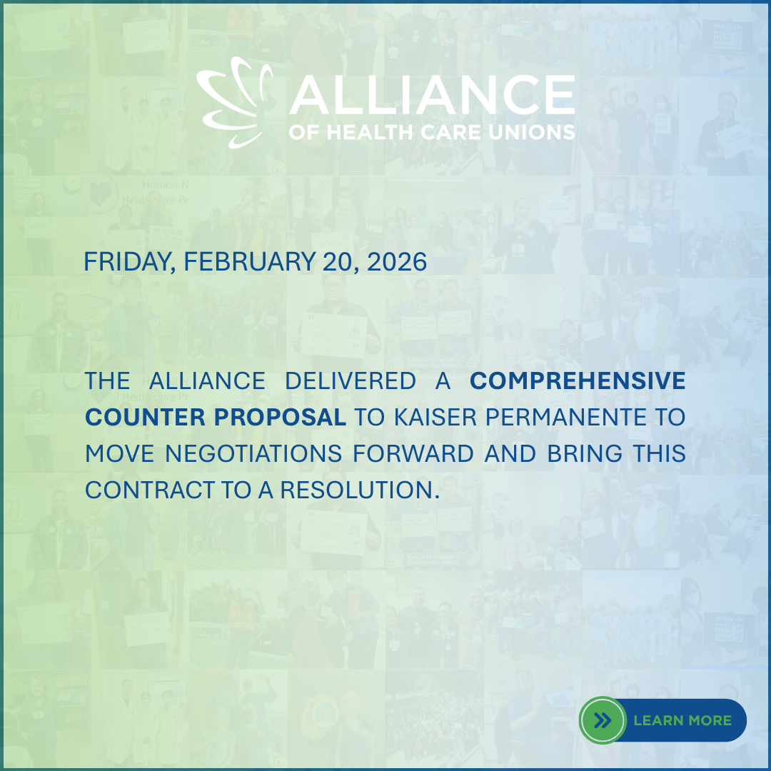 Today, the Alliance delivered a comprehensive package proposal to Kaiser Permanente that resolves and protects our National Agreement and delivers a clear message to KP: It’s time to settle the National Agreement. Read more about the proposal here.