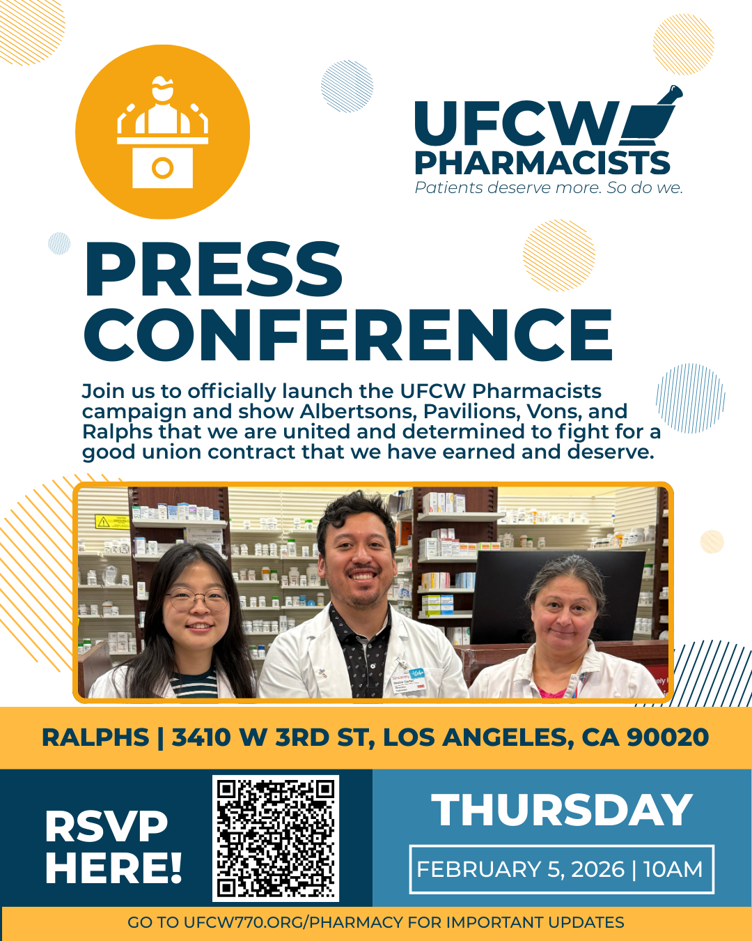 Join our campaign kick-off press conference on March 2, 2026, at 10:00 AM at Ralphs on 3410 W 3rd St, Los Angeles, CA 90020. Talk to your union representative or bargaining committee members to make a plan to attend. Register for the event here: https://forms.gle/gxjzmVR5pz5LreNb9
